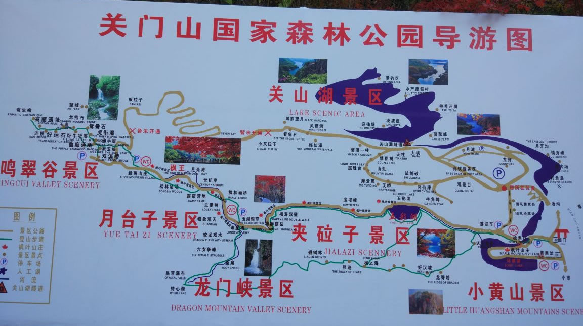 森林公園內(nèi)有四大景區(qū)小黃山景區(qū)、夾砬子景區(qū)、龍門峽景區(qū)和月臺(tái)子景區(qū),共計(jì)108處景點(diǎn)。它有三道門:北門,在小市方向,雙峰對峙,中間拱橋相連;南門,在去湯溝的嶺頂,公路從中穿過,十分險(xiǎn)要;中門,在深谷河道中,“雙扉”夾水,寬只二十余米,為興修水庫的天然門柱,有人把關(guān)門山風(fēng)景譽(yù)為“小江南”,“賽黃山”,說它有五美:山美,陡峭,俊秀,似一簇簇盆景;樹美,樹木種類繁多,特別是秋天的楓葉,冬季植根于峭壁上的蒼松,非常壯觀;水美,湯河穿過山谷,匯集小溪,飛瀑,“奪門”而出,似來自于天際;花美,天女木蘭,山杜鵑,漫山遍野;云美麗,清晨雨后,山谷中云霧繚繞,如披輕紗,分外嫵媚。歷代文人多有詩篇贊頌,許多美術(shù)工作者,經(jīng)常到這里寫生、作畫。