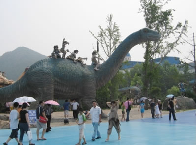 侏羅紀(jì)激流探險(xiǎn),總占地面積8600平方米,以一種時(shí)空穿插的景觀設(shè)計(jì)手法,將五種八只侏羅紀(jì)時(shí)期的恐龍置身于虛幻的遠(yuǎn)古村落中。載客古船,沿210米長,15米高的水道激流急下,沿途中,一只高9米,長19.8米,重約8噸的亞洲最大的機(jī)械恐龍“巨無霸”,不時(shí)的向沖刺在激流中的游人搖頭擺尾,吼叫或噴水,載客古船激起的25米高的巨浪。 旅游船