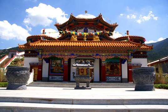 廣宗寺,其整個建筑氣勢宏偉,富麗堂皇。主要建筑有大雄寶殿、大經(jīng)堂、黃樓寺等。其中供奉西藏第六世達賴?yán)镞z體寶塔的大殿稱為“黃樓寺”。黃樓寺是一座兩層樓閣的建筑,其前部為81間,后部為49間,全部用黃、綠色琉璃瓦砌成,極為富麗。