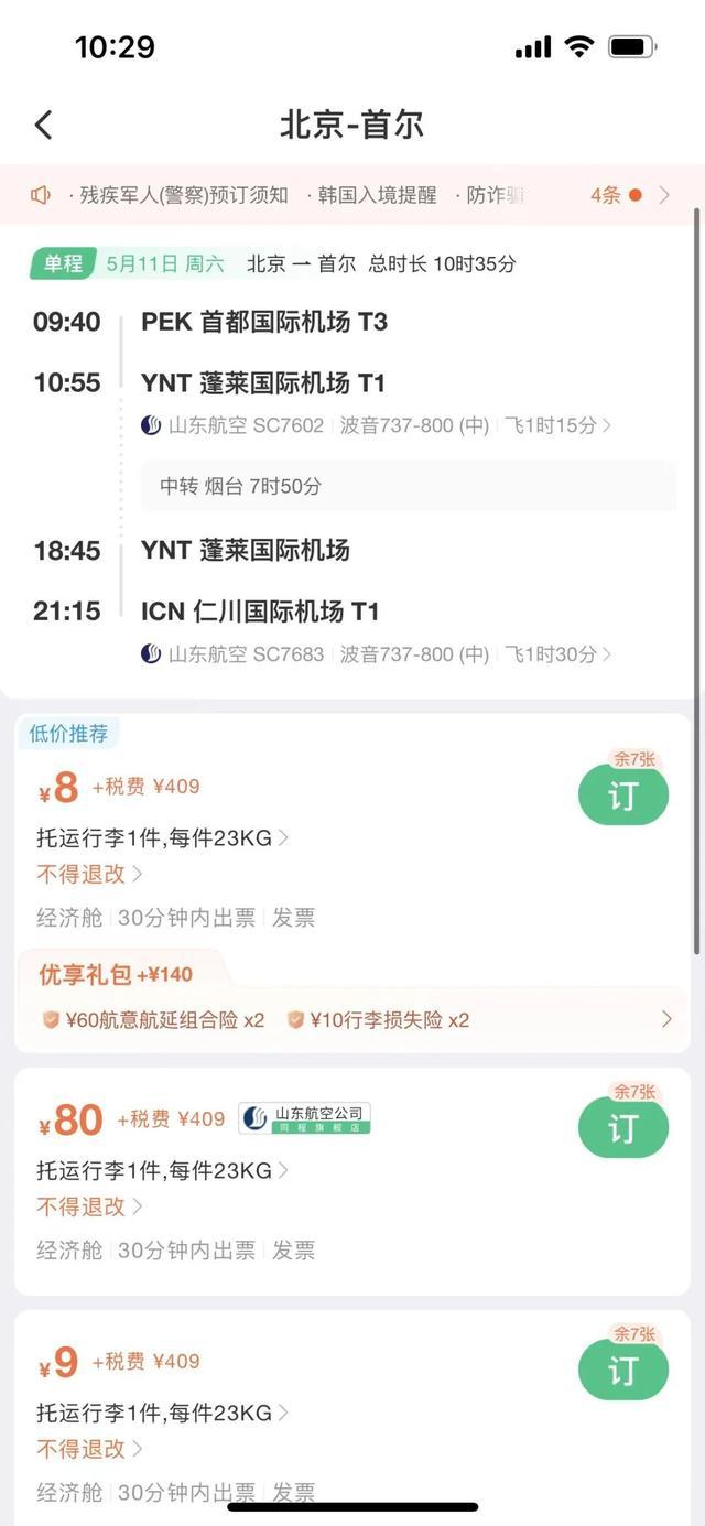 國際機(jī)票方面,中新經(jīng)緯查詢發(fā)現(xiàn),5月11日北京飛往首爾的機(jī)票(不含稅)價格低至8元,但另需409元稅費。具體來看,該航班5月11日早9點40分從北京首都機(jī)場起飛,經(jīng)煙臺蓬萊國際機(jī)場轉(zhuǎn)機(jī),于當(dāng)天晚上9點15分落地仁川國際機(jī)場。