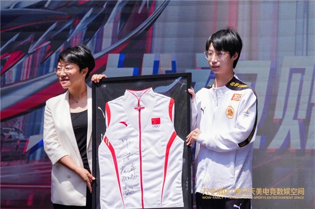 開(kāi)業(yè)現(xiàn)場(chǎng)還舉辦了隆重的授牌儀式。由杭州第19屆亞運(yùn)會(huì)電子競(jìng)技王者榮耀亞運(yùn)版本冠軍選手林恒,上臺(tái)將由6位亞運(yùn)冠軍簽名的戰(zhàn)袍贈(zèng)予了萬(wàn)斐酒店騰訊天美電競(jìng)數(shù)娛空間項(xiàng)目。