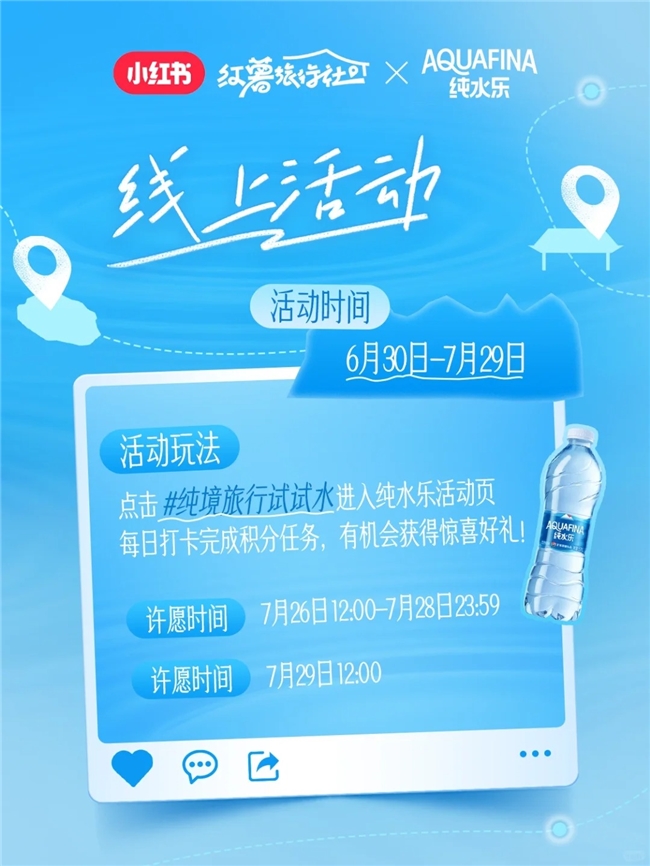 近期,純水樂與小紅書「紅薯旅行社」聯(lián)合打造的「純境旅行試試水」活動火熱上線,在6月30日-7月29日為期一個月的主題活動中,聚合三大純境路線極致輕松悠閑體驗、線路途中尋找隱藏純境打卡站等優(yōu)質(zhì)內(nèi)容,加入小紅書站內(nèi)許愿領(lǐng)禮品、線下拍照打卡發(fā)筆記贏好禮等活動玩法,讓整個活動充滿向往感和驚喜。