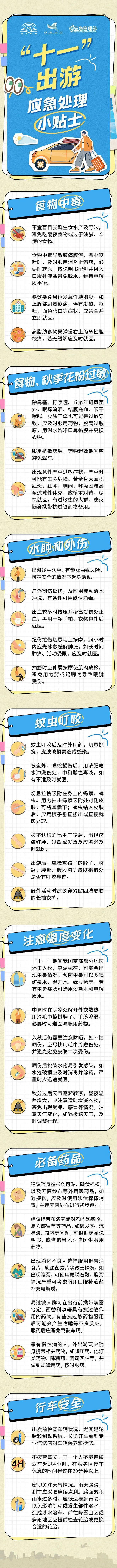 國慶假期馬上就到啦,相信很多人都有出游計劃。中國疾控中心聯(lián)合科普中國和應急管理部,專門給大家準備了一份《“十一”出游應急處理小貼士》,祝大家過個愉快又安全的假期!