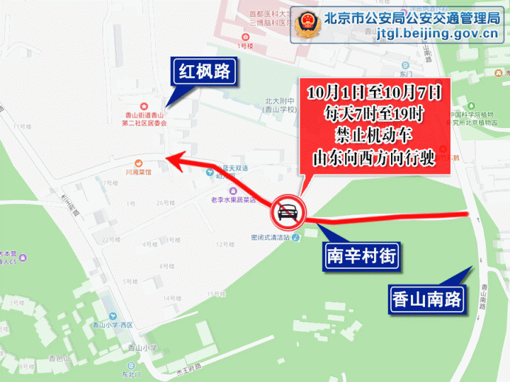 10月1日至10月7日,每天7時至19時,海淀區(qū)南辛村街(紅楓路至香山南路段)禁止機動車由東向西方向行駛。