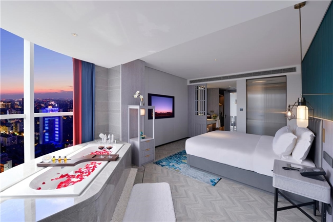 客房哲學(xué):320間客房搭配全景落地窗設(shè)計,干濕分離設(shè)計搭配臨窗浴缸,申寶冷暖床墊實現(xiàn)“冬暖夏涼”智能溫控,高端雅蘭布草,細節(jié)處彰顯東方待客之道。