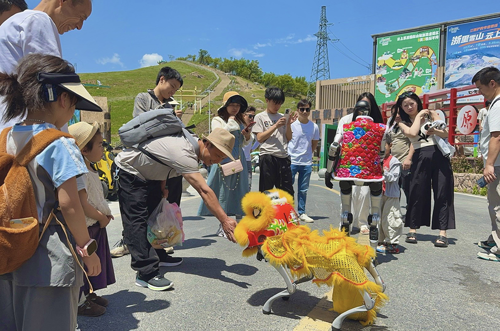 宇樹機(jī)器人與機(jī)器狗戰(zhàn)隊(duì)正在草坪上“營業(yè)”,科技感十足的巡游表演吸引大批游客圍觀。萌寵機(jī)器人不僅能隨音樂蹦迪,還能與小朋友擊掌互動(dòng),現(xiàn)場(chǎng)歡笑聲不斷。