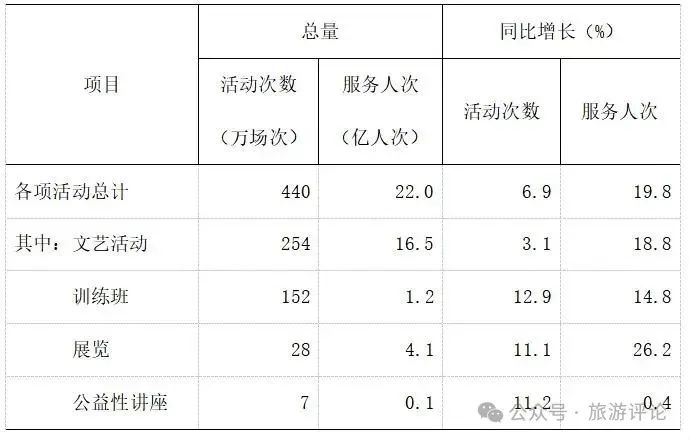 全年全國群眾文化機(jī)構(gòu)共組織開展各類文化活動440萬場,同比增長6.9%;服務(wù)22億人次,同比增長19.8%。
