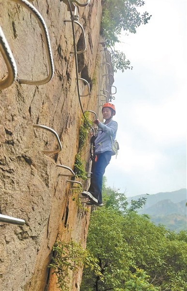 崔女士熱愛徒步,這次是跟隨徒步群一起參加飛拉達體驗活動。她記得,剛剛站上幾米高的巖壁回頭望下去時,心里還是“咯噔”了一下,有些發(fā)怵。“剛開始要調兩個鐵扣時我有些慌,越慌越怕,后來操作熟了,發(fā)現始終有一個扣子在鋼絲上,安全感一下子就上來了。”