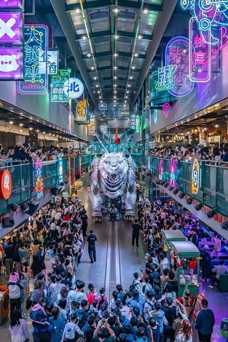 熊洞街是一個(gè)由4800平方米廢棄工業(yè)廠房改造的沉浸式IP樂園,樂園里有巨獸巡游、時(shí)尚文創(chuàng)、科技研學(xué)、特色美食等元素,用文化、科技、藝術(shù)結(jié)合的方式,打造了一個(gè)“尖叫地標(biāo)”,并通過“巨熊北北”這個(gè)超級(jí)IP,把文旅和商業(yè)業(yè)態(tài)有機(jī)融合在一起。