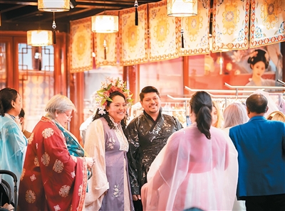 外國游客在深圳錦繡中華民俗村身穿漢服沉浸式游園。