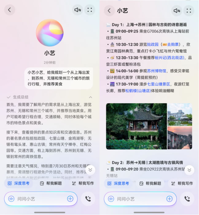 對(duì)于多城聯(lián)游來(lái)說(shuō),行程規(guī)劃十分復(fù)雜。在鴻蒙5的加持下,擁有全新大腦的對(duì)話思考式小藝變得“更聰明”,能理解用戶需求并給出針對(duì)性的回答。用戶只需對(duì)小藝說(shuō)出需求,例如:“小藝小藝,給我規(guī)劃一個(gè)蘇錫常園林和美食主題三日游。”小藝便能迅速生成一份詳盡的圖文攻略,將蘇州的古典園林、無(wú)錫的太湖風(fēng)光,以及常州獨(dú)具特色的中華恐龍園都囊括其中,給出路線、交通、美食等建議。旅途中遇到感興趣的建筑或是不認(rèn)識(shí)的植物,也可以隨時(shí)拍照后拖給小藝或圈選屏幕問(wèn)問(wèn)小藝,即時(shí)獲得百科解答,讓旅途充滿探索的樂(lè)趣。