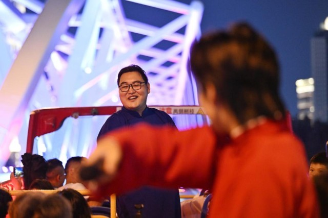 “相聲巴士”的定制化夜間游覽線路,將古文化街、鼓樓、意式風(fēng)情區(qū)、解放橋、天津站世紀鐘、津灣廣場、望海樓、“天津之眼”摩天輪等20余處地標景點串聯(lián)成線。演員在途中結(jié)合景點進行講解,讓觀眾除了能享受海河兩岸夜景和沉浸式津味相聲外,還能深入了解天津歷史,品味天津特色文化。