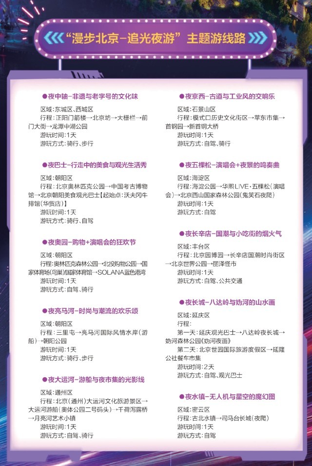 旅游線路推薦也有了夜間“專屬套餐”。繼2024年推出“月光下的北京”城市夜游指南,北京市文旅局在今年又推出10條“漫步北京-追光夜游”主題游線路,聯(lián)動(dòng)互聯(lián)網(wǎng)生活服務(wù)平臺(tái),以熱門線路為依托,打造出“可逛、可玩、可吃、可曬”的沉浸式體驗(yàn),深化文商旅融合。上萬(wàn)家商戶推出專屬套餐,輻射文旅、餐飲、零售等多元場(chǎng)景,為北京夜經(jīng)濟(jì)注入強(qiáng)勁新活力。