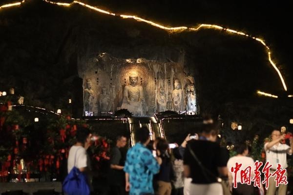 8月19日,河南洛陽(yáng),游客在夜色中參觀龍門(mén)石窟的賓陽(yáng)洞。中青報(bào)·中青網(wǎng)記者 余冰玥/攝