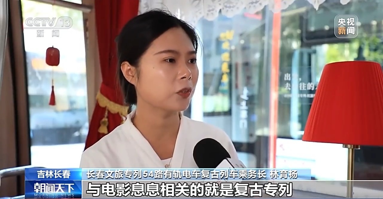長(zhǎng)春文旅專列54路有軌電車復(fù)古列車乘務(wù)長(zhǎng) 林育楊:與電影息息相關(guān)的就是復(fù)古專列。它的起始站就是長(zhǎng)影舊址博物館,途經(jīng)東風(fēng)大街、創(chuàng)業(yè)大街、南陽(yáng)路,都是熱播劇的取景地。