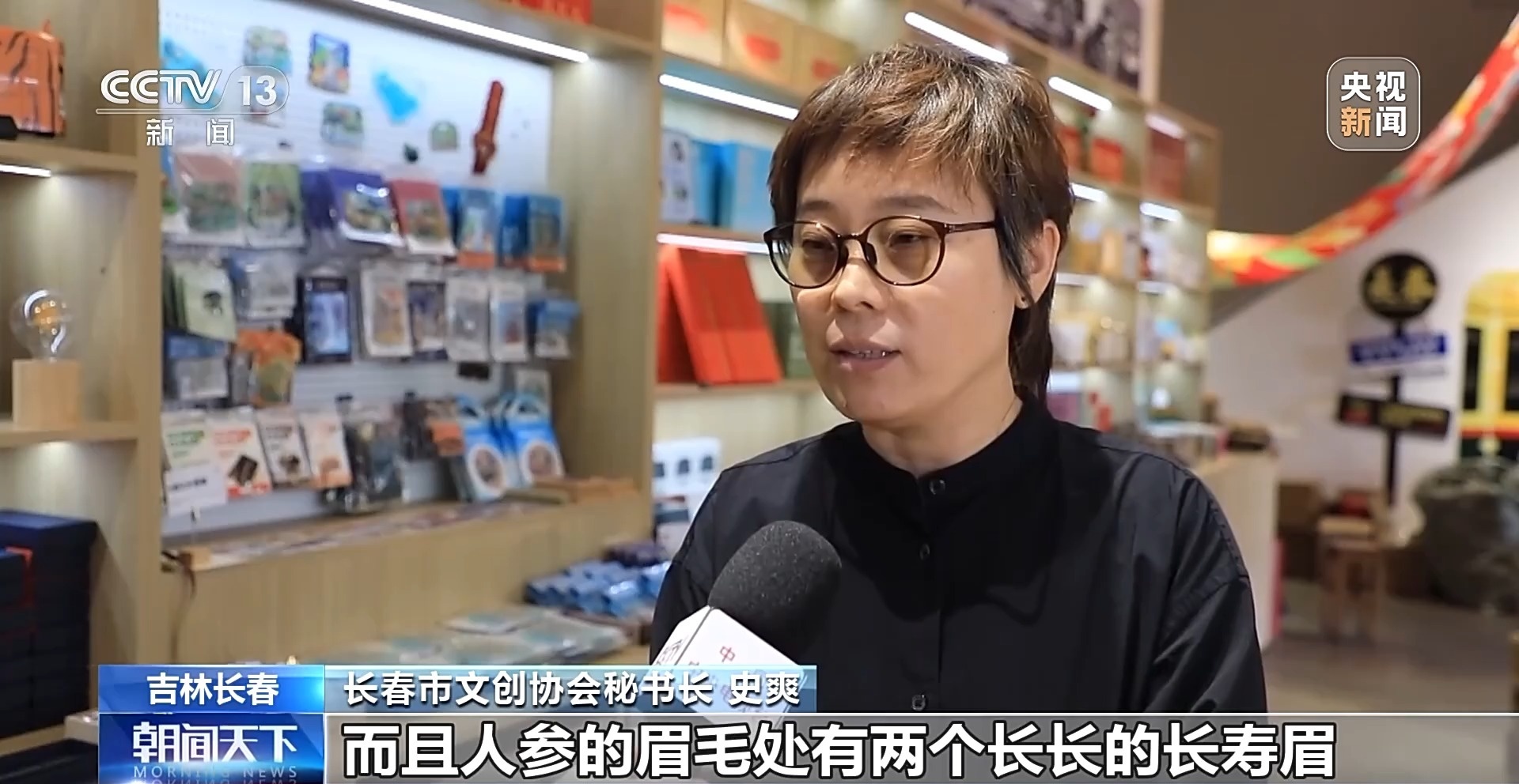 長(zhǎng)春市文創(chuàng)協(xié)會(huì)秘書(shū)長(zhǎng) 史爽:因?yàn)槲覀兗质∈侨藚⒌闹饕a(chǎn)地,上面的紅圍脖結(jié)合了我們?cè)械娜藚⒌涔,系紅繩的這樣的一個(gè)典故,而且人參的這眉毛處有兩條長(zhǎng)長(zhǎng)的長(zhǎng)壽眉,象征著吉祥如意。
