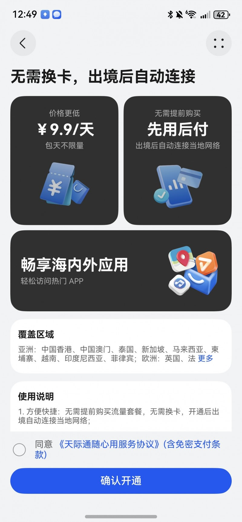 緊接著,天際通第二重禮·隨心用——9.9元/天多地流量隨心用,針對(duì)多地旅行或深度游用戶,天際通推出「9.9元/天多地流量隨心用」服務(wù),用戶無需換卡,支持先用后付,按需付費(fèi)。每24小時(shí)僅需9.9元,享5GB高速流量+常速不限量,覆蓋歐美、東南亞等50個(gè)熱門地區(qū);單次開通長(zhǎng)期有效,不用不扣費(fèi),聯(lián)程轉(zhuǎn)機(jī)無縫銜接。