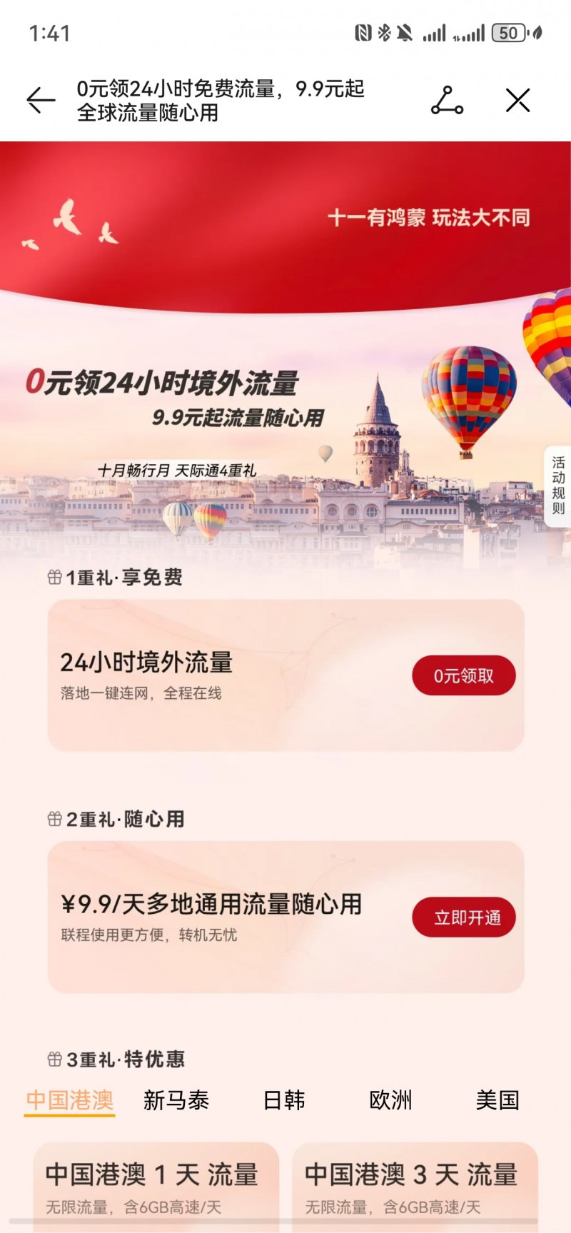 國(guó)慶長(zhǎng)假將至,出境游熱度飆升,9月17日至10月31日,華為天際通「十月暢行月」福利活動(dòng)開啟,推出4重超值禮遇,從免費(fèi)流量、按天計(jì)費(fèi)到本地權(quán)益全覆蓋,讓用戶真正實(shí)現(xiàn)說走就走,暢行無憂。