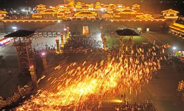 10月3日晚,游客在山東省臨沂市郯城縣郯國古城景區(qū)觀看打鐵花。新華社發(fā)(張春雷攝)