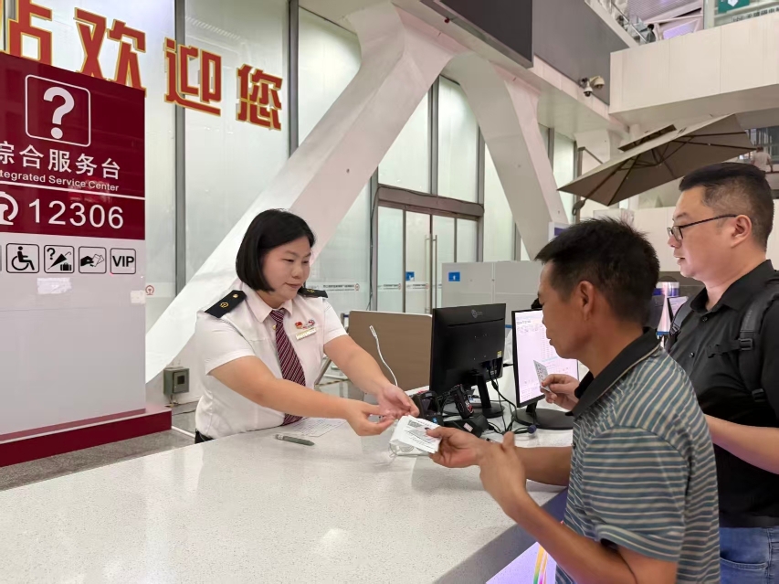 廣州南站綜合服務(wù)臺(tái)工作人員為旅客辦理業(yè)務(wù),提供12306一站式服務(wù)