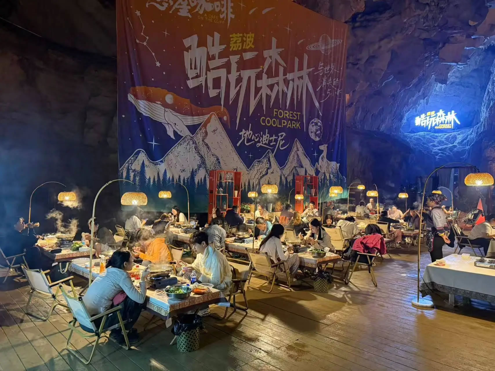 探險(xiǎn)之后,在常年保持15攝氏度的洞穴餐廳,吃上一頓熱氣騰騰的火鍋,感受與洞外溫差帶來的獨(dú)特體感,成為游客們的特別享受。開闊的洞廳內(nèi),數(shù)十張餐桌整齊排列,餐桌上方的暖色照明燈既保證了用餐所需的足夠亮度,又完整保留了洞穴的自然氛圍。游客們一邊圍坐火鍋旁大快朵頤,一邊欣賞巖壁上自然形成的奇異紋路,感受這個(gè)地下空間獨(dú)有的神秘。