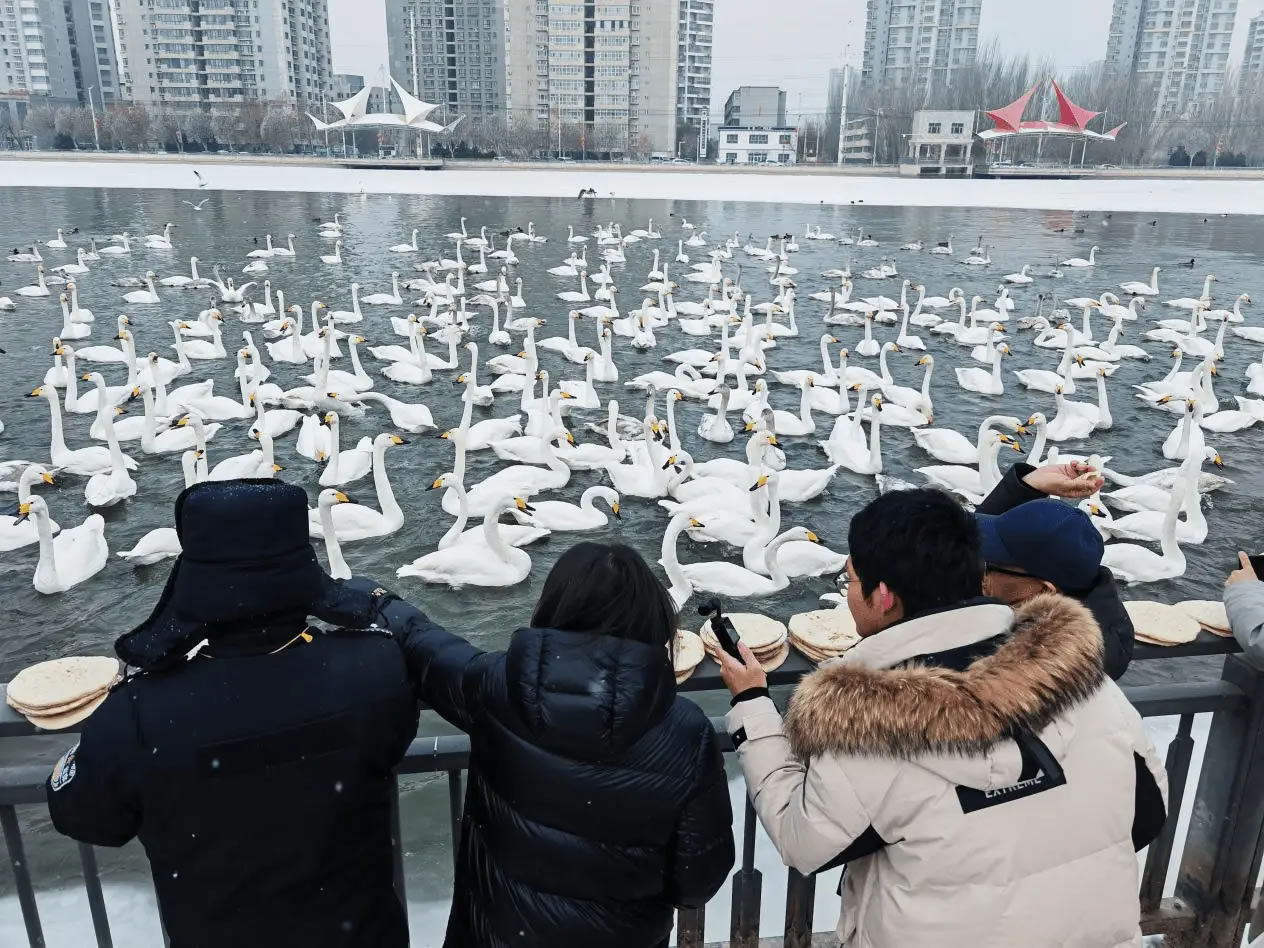 而天鵝們“鐘情”于庫爾勒白皮馕的趣味習性,更是拉近了人與鳥的距離。每當天鵝護衛(wèi)隊員的哨聲響起,天鵝便會從四面八方聚攏而來,市民游客投喂的馕塊與天鵝歡快的鳴叫聲交織成一曲和諧的城市樂章。這溫馨的日常,是庫爾勒人文溫度與生態(tài)文明深度內化的生動體現(xiàn)。