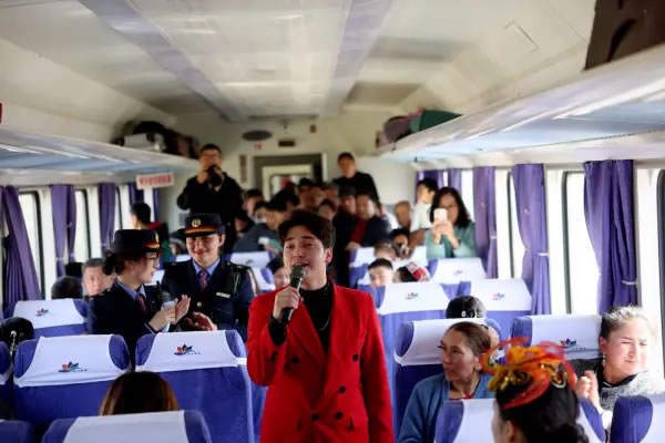 火車上,《和田是個好地方》《新疆姑娘》《祝福祖國亞克西》等經典文藝節(jié)目輪番上演,悠揚的旋律和深情的演唱打動著在場的每一位旅客,讓車廂成為流動的舞臺。文藝表演結束后,文旅資源宣傳推介環(huán)節(jié)緊隨其后,工作人員通過生動講解與展示,帶領旅客提前領略和田的獨特風光與人文魅力。此外,宣講人員還用接地氣的家常話、互動感十足的小問答,把理論知識講得鮮活有趣,讓旅客們在旅途的碎片時光里,既能放松休憩,又能輕松收獲思想啟迪,讓出行多了一份別樣的“精神補給”。