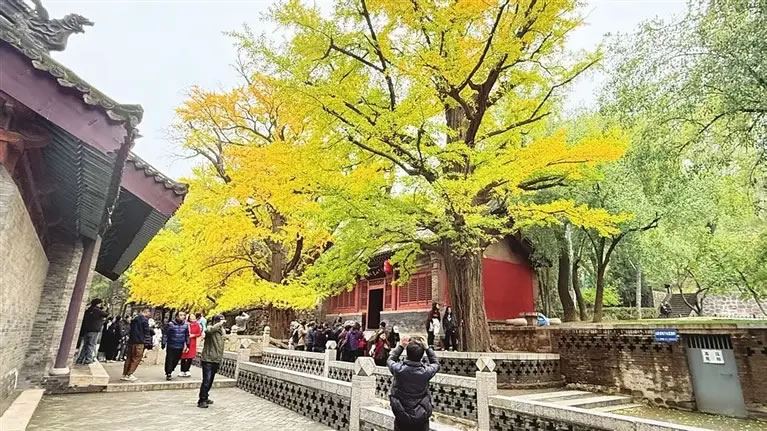 據工作人員介紹,這兩株枝干相依的古銀杏不僅是“資深網紅”,更是承載歷史的“活文物”。它們歷經500年風雨,至今枝繁葉茂,每年深秋都會如期換上“黃金盛裝”,與圣母殿、魚沼飛梁等著名古建筑共同構成一幅動人的秋日畫卷。