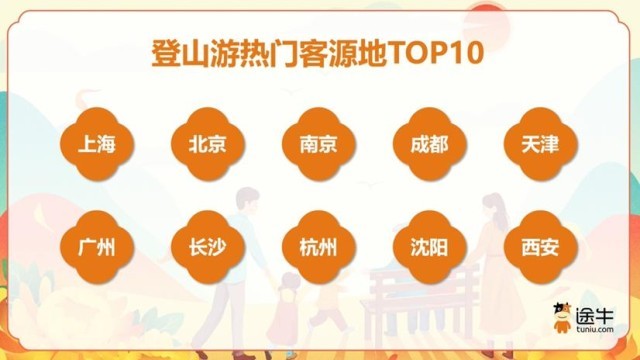 《報(bào)告》數(shù)據(jù)顯示,二線及以上城市用戶是登山游的主力軍,在今年途牛登山游用戶中的出游人次占比超過(guò)了70%。其中,上海、北京、南京、成都、天津、廣州、長(zhǎng)沙、杭州、沈陽(yáng)、西安等是排名靠前的客源地城市。