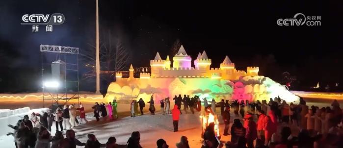 夜幕下的漠河市北極村被燈光點(diǎn)亮,惟妙惟肖的雪雕有了不一樣的顏色。在小廣場(chǎng)上,天南地北的游客聚在一起攜手起舞,并用鏡頭記錄下浪漫的煙火。為滿足滑雪愛好者的需求,當(dāng)?shù)匮﹫?chǎng)今年首次開放夜滑,并新增了雪道。