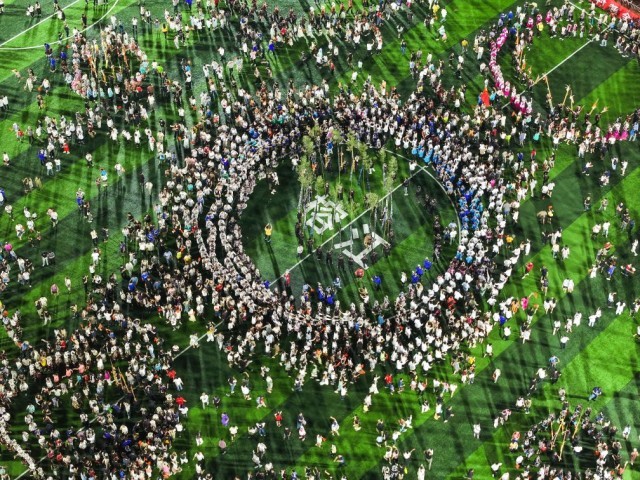 8月23日,人們?cè)谫F州“村超”球場(chǎng)跳苗族蘆笙舞(無(wú)人機(jī)照片)。新華社記者楊文斌 攝