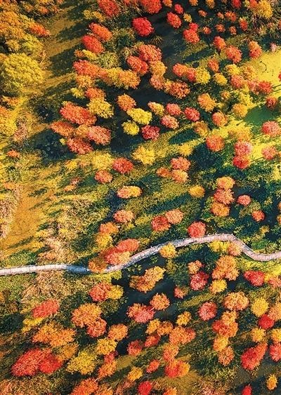 泛舟前行,只見(jiàn)紅綠相間的池杉倒映水中,宛如流動(dòng)的油畫(huà)。