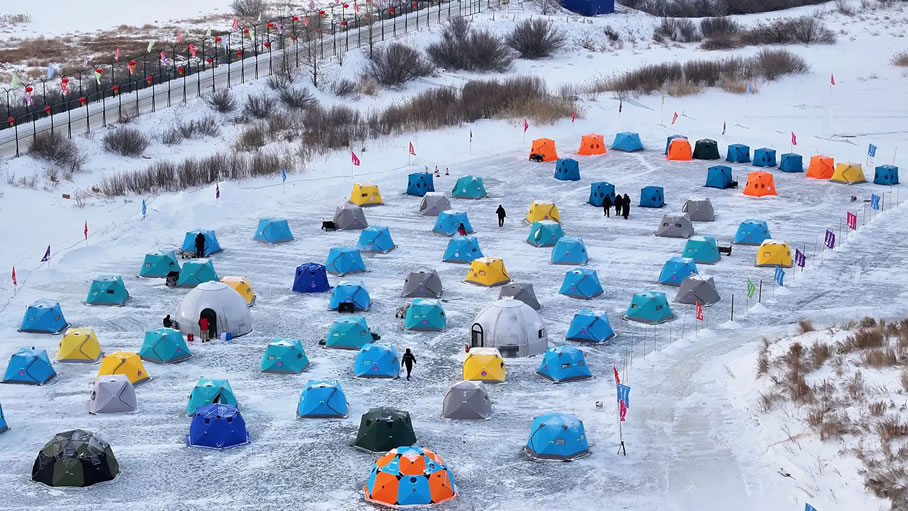 活動融合冰釣體驗(yàn)、民俗展演與文化展示等,為游客打造了一場集運(yùn)動、美食、互動于一體的沉浸式冰雪文旅盛宴。作為核心項(xiàng)目,中俄界河冰釣與冰捕區(qū)備受矚目。界河之上,五顏六色的暖帳錯(cuò)落排布,冰釣愛好者早已按捺不住垂釣熱情,在帳篷內(nèi)生起暖爐、鑿開冰面、下好魚餌,支起小板凳,靜觀浮漂等候“佳音”。