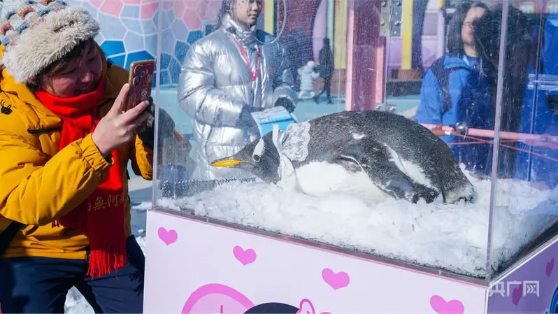 游客與企鵝互動打卡(央廣網發(fā) 大連圣亞海洋世界供圖)