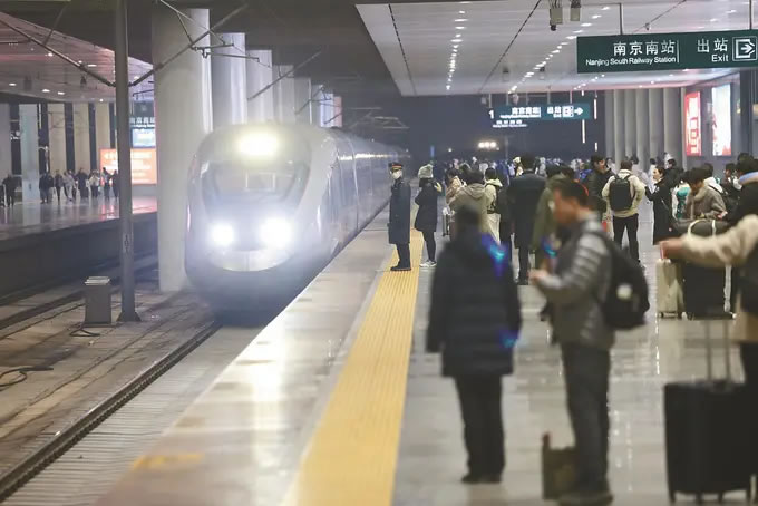 從1月26日零時起,全國鐵路實行新的列車運行圖,調圖后,圖定旅客列車較原圖增加243列。京滬高鐵標桿列車G25次迎來了“瘦身”升級:這趟京滬間最快高鐵取消原有5個?空荆瑑H設南京南站唯一經停點。圖為當日晚,旅客在南京南站準備乘坐G25次列車。(陳儼 攝)