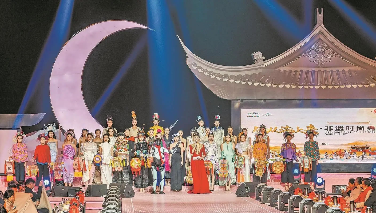時(shí)尚秀分上、下兩篇。開場(chǎng)展示宋代迎客禮儀,還原宋人風(fēng)雅。上篇“海上生明月”以生活化的“海”為主線,通過《月娘月光光》表演唱、南音《庭院七弦響》、情景表演《海的女兒》等節(jié)目,融合惠安女織網(wǎng)、蟳埔女簪花、茶道香道等非遺元素,搭配模特走秀,展現(xiàn)人與海的和諧共生。下篇“匠心映月輝”以非遺技藝的“匠”為核心,國潮樂隊(duì)《奇跡》、南少林武術(shù)《少林雄風(fēng)》、民間舞蹈《雙鐵尺舞》等節(jié)目,將非遺技藝與現(xiàn)代設(shè)計(jì)結(jié)合,凸顯力與美的碰撞。尾聲,全體模特手持花燈、瓷器等非遺作品返場(chǎng),與歌曲《泉州人》共鳴,寓意“燈火萬家明”,點(diǎn)亮泉州夜空。