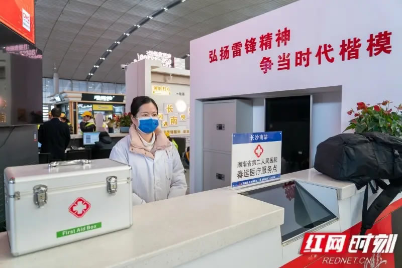 為保障春運(yùn)期間旅客健康出行,湖南多個(gè)車(chē)站升級(jí)了醫(yī)療服務(wù)措施。長(zhǎng)沙南站聯(lián)合湖南省第二人民醫(yī)院,在“湘遇長(zhǎng)南雷鋒服務(wù)站”設(shè)立了便民醫(yī)療點(diǎn),配有醫(yī)護(hù)人員駐守,提供免費(fèi)的健康咨詢、醫(yī)療救護(hù)以及基礎(chǔ)應(yīng)急藥品與設(shè)備。