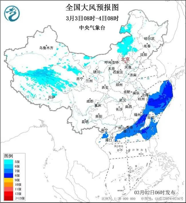 預(yù)計(jì),3月2日08時(shí)至3日08時(shí),新疆東部、西藏中西部、青海北部、內(nèi)蒙古大部、江蘇東部等地將有5~6級(jí)、陣風(fēng)7~8級(jí)的大風(fēng);黃海中部和南部海域、東海大部海域、臺(tái)灣海峽、臺(tái)灣以東洋面、南海東北部偏北海域?qū)⒂?~8級(jí)、陣風(fēng)9級(jí)的大風(fēng),其中黃海東南部海域、東海北部海域風(fēng)力可達(dá)9~10級(jí)、陣風(fēng)11級(jí)。