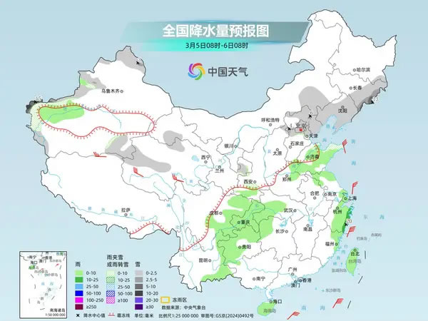 明天,黑龍江東南部、吉林東部、新疆西部和北部山區(qū)、青海北部、甘肅河西、陜西北部、山西中南部等地部分地區(qū)有小到中雪或雨夾雪,其中,吉林東部、新疆南疆西部山區(qū)、山西東南部等地局地有大到暴雪。