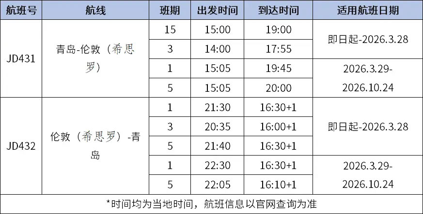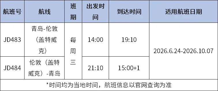 青島往返倫敦(希思羅)航線航班時(shí)刻如下(均為當(dāng)?shù)貢r(shí)間,航班信息以官網(wǎng)查詢?yōu)闇?zhǔn)):