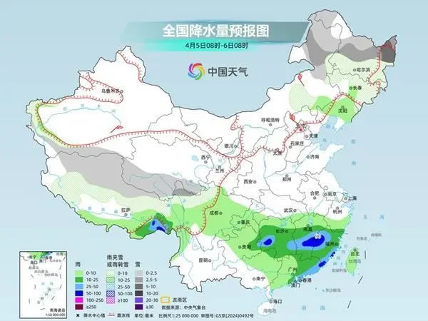 中央氣象臺預(yù)計,4月5日,內(nèi)蒙古東部、東北地區(qū)中北部、西藏西部和北部、青海南部、川西高原北部等地部分地區(qū)有小雪或雨夾雪,其中,內(nèi)蒙古東北部、黑龍江中北部、川西高原北部等地部分地區(qū)有中到大雪。西藏東南部、江南中南部、廣東中東部等地部分地區(qū)有中到大雨,其中,西藏東南部、湖南西部、江西中南部、福建西部和東南部沿海等地部分地區(qū)有暴雨。