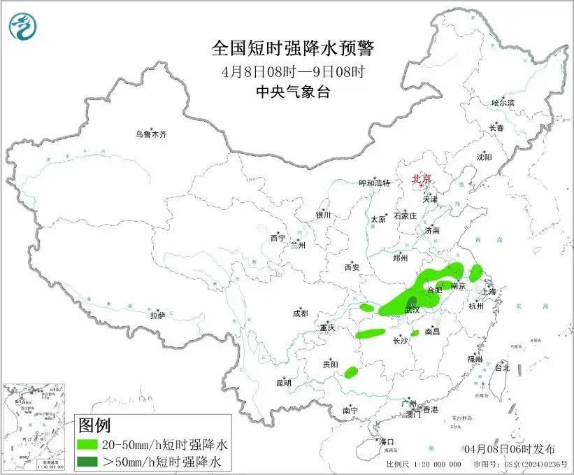 預(yù)計(jì),4月8日8時(shí)至9日8時(shí),湖北南部和東部、安徽中北部、河南南部、江蘇中北部等地部分地區(qū)有大到暴雨,其中,湖北東部局地有大暴雨(100~150毫米)。上述部分地區(qū)伴有短時(shí)強(qiáng)降水(最大小時(shí)降雨量20~40毫米,局地可超過50毫米),局地有雷暴大風(fēng)或冰雹等強(qiáng)對(duì)流天氣。