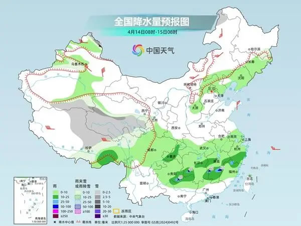 明天,新疆北部和南疆盆地、西藏中東部、青海中南部、川西高原北部以及內蒙古東北部、黑龍江東南部等地部分地區(qū)有小雪或雨夾雪,其中,新疆阿勒泰等地部分地區(qū)有中到大雪;西藏東南部、重慶中西部、貴州東南部、湖南中南部、江西大部、浙江中南部、福建西部和北部、廣西北部等地部分地區(qū)有中到大雨,其中,江西中南部、福建西部等地局地有暴雨。
