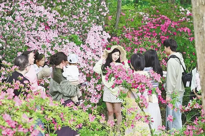 武漢植物園游客觀賞杜鵑花。 (湖北日報通訊員 陳鈺嶺 攝)