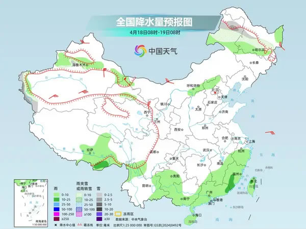 明天,內(nèi)蒙古東北部、黑龍江中部、新疆南疆西部山區(qū)等地部分地區(qū)有小到中雪或雨夾雪;江南中東部和南部、西南地區(qū)南部、華南大部、臺(tái)灣島等地部分地區(qū)有小雨,局地中雨。