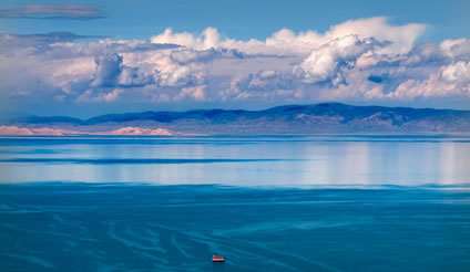 青海省青海湖景區(qū),位于青藏高原的東北部、西寧市西北部、剛察縣南部,距西寧市136公里。青海湖古稱“西!,又稱“仙!薄ⅰ磅r水!、“卑禾羌!,是中國(guó)最大的內(nèi)陸湖、最大的咸水湖。湖面海拔3196米,湖岸線長(zhǎng)360公里,面積4583平方公里,湖水冰冷且鹽份很高。湖中有海心山,四周高山環(huán)繞:北面是大通山,東面為日月山,南面是青海南山,西面為橡皮山。湖區(qū)盛夏時(shí)節(jié)平均氣溫僅15℃,為天然避暑勝地。