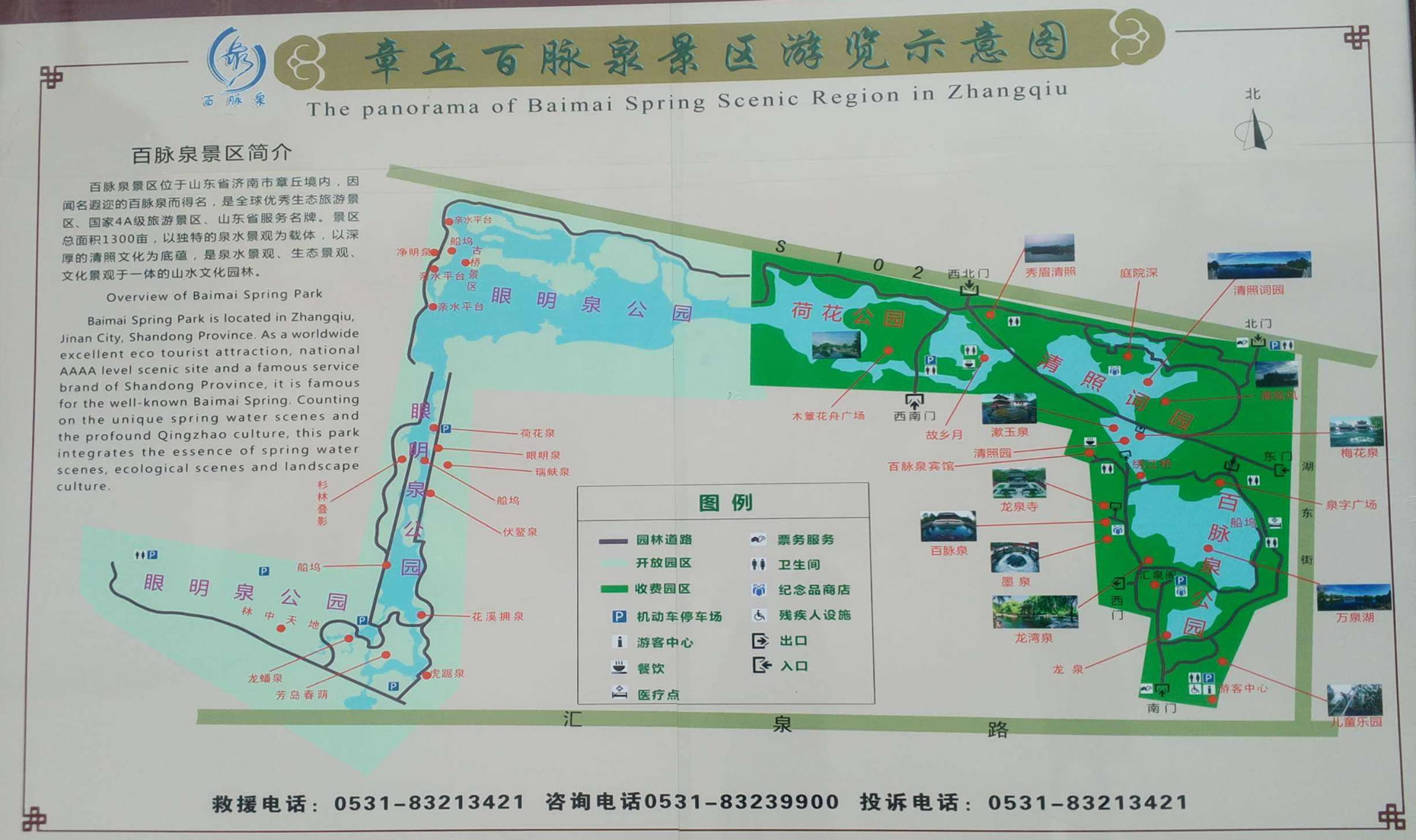 公園布局由著名園林專家孫筱祥先生設(shè)計(jì),園名由已故著名書法大師舒同題寫。園內(nèi)噴泉5處,石拱橋3座,石土假山2座,石、木板平橋、各一架。并建有匯泉閣、湖心亭、船塢碼頭等。公園景點(diǎn)布局因地緣勢,順?biāo)飨,逐次展開,設(shè)計(jì)獨(dú)特,構(gòu)思巧妙。全園分為泉水、花園、幽靜學(xué)習(xí)、林蔭散步、兒童樂園5個區(qū)。泉水區(qū):奇花異草,千姿百態(tài)、鳥語花香,競相斗艷。幽靜學(xué)習(xí)區(qū):環(huán)境幽雅,空氣清新,掩卷吟歌,浮想聯(lián)翩。密林散步區(qū):小橋流水,蜿蜒曲折,灌木叢生,暗柳成蔭。兒童樂園區(qū):游龍戲水,木馬滑梯,蕩秋千,跳蹦蹦床,高架橋,星空穿梭游藝機(jī),樂不思?xì)w。公園內(nèi)樓、臺、亭、榭、閣,點(diǎn)綴其間,錯落有致,相互輝映。假山、密林、湖水、斷橋,別有洞天,可謂“疑是山窮水無路,柳暗花明又一景”。濟(jì)南七十二名泉中的百脈泉乃園中勝景,公園也因之得名。1997年5月,又在園西北隅建成清照罷工(李清照紀(jì)念館),公園風(fēng)光無限,更添春色。百脈泉公園是鑲嵌在章丘大地上的一顆明珠。百脈泉公園,位于山東省濟(jì)南市章丘區(qū)明水境內(nèi),這里是龍山文化的發(fā)祥地,一代詞宗李清照的故里。