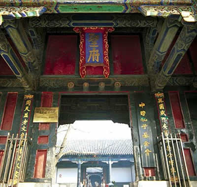孔府位于曲阜城的中心,坐北朝南,迎面是一個(gè)粉白的大照壁,門前左右兩側(cè),有一對(duì)2米多高的圓雕雌雄石獅。紅邊黑漆的大門上鑲嵌著狻猊鋪首,大門正中上方的高懸著藍(lán)底金字的“圣府”匾額,門兩旁明柱上,懸掛著一對(duì)藍(lán)底金字對(duì)聯(lián):與國(guó)咸休安富尊榮公府第,同天并老文章道德圣人家。這副對(duì)聯(lián)相傳是清人紀(jì)均的手書。文佳字美,形象地說明了孔府在封建社會(huì)中的顯赫地位。這副對(duì)聯(lián)口氣之大自不待言,發(fā)人深思的是上聯(lián)“安富尊榮”的富字,下聯(lián)“文章道德”的章字,從上圖可以看出,“富”字上少了一 點(diǎn),“章”字中多了一筆,意思是說衍圣公官職位列一品,田地萬