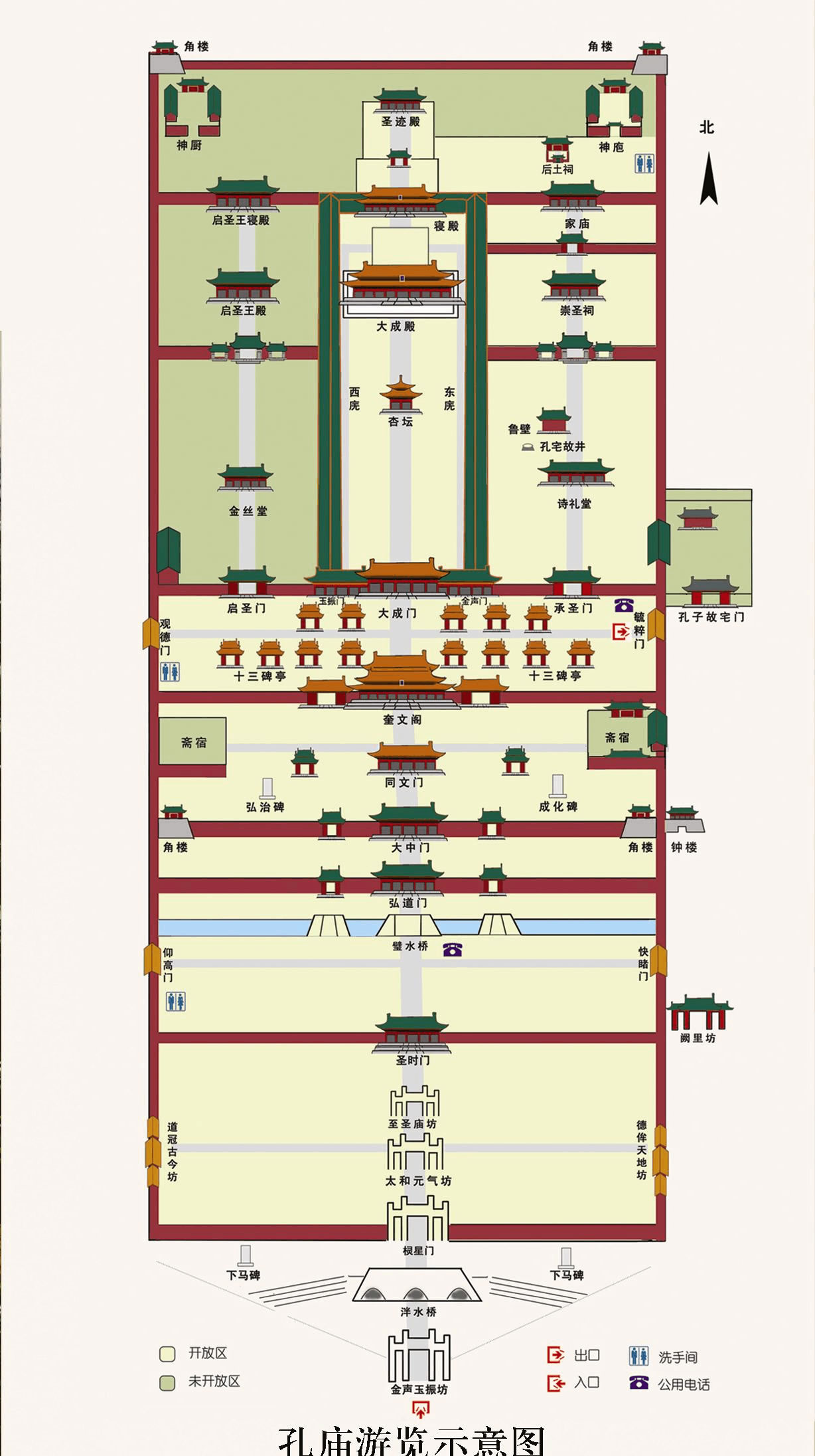 壁水橋北為弘道門(mén),是明洪武十年(公元1377年)時(shí)孔廟的大門(mén),清雍正七年據(jù)《論語(yǔ)》“人能弘道”欽定命名,以贊頌孔子闡發(fā)了堯舜禹湯和文武周公之道。門(mén)下有元碑兩塊,東四棱碑為“曲阜縣歷代沿革志”,記載了曲阜的變遷沿革,史料價(jià)值很高西碑為“處士王處先生墓表”頗有書(shū)法價(jià)值,是1966年移入孔廟保管的。