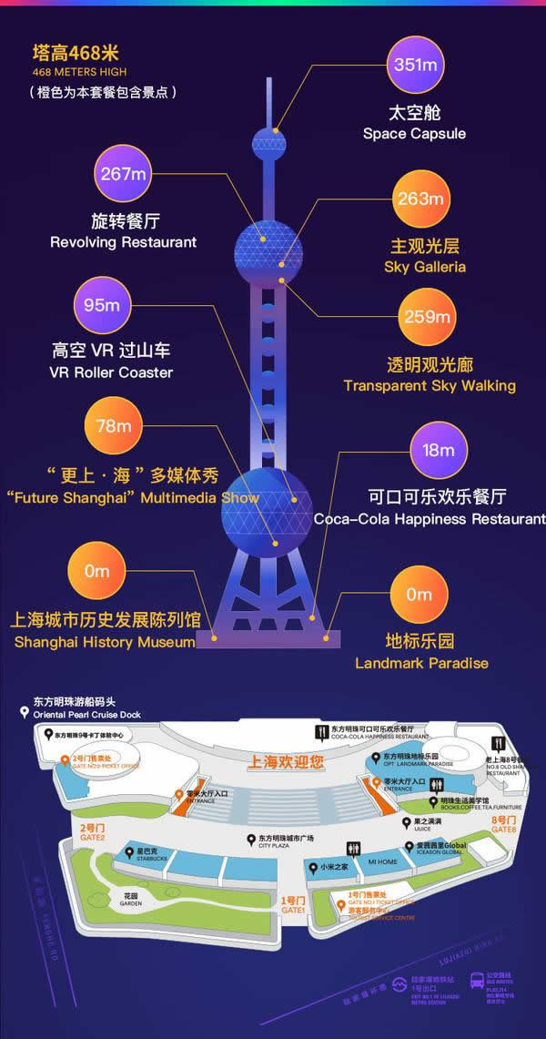 東方明珠廣播電視塔內(nèi)共有5個(gè)觀光層,主要由高90米、直徑50米的下球體室外觀光廊和高272.5米、直徑45米的上球體觀光層組成,是鳥瞰上海全市的最佳場(chǎng)所之一。